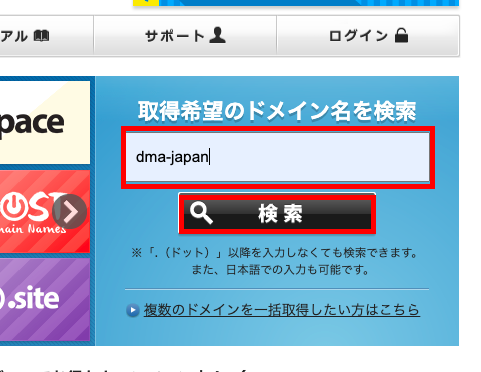 取得希望のドメイン名を検索ボックスに入力し、「検索」ボタンをクリックしてください。