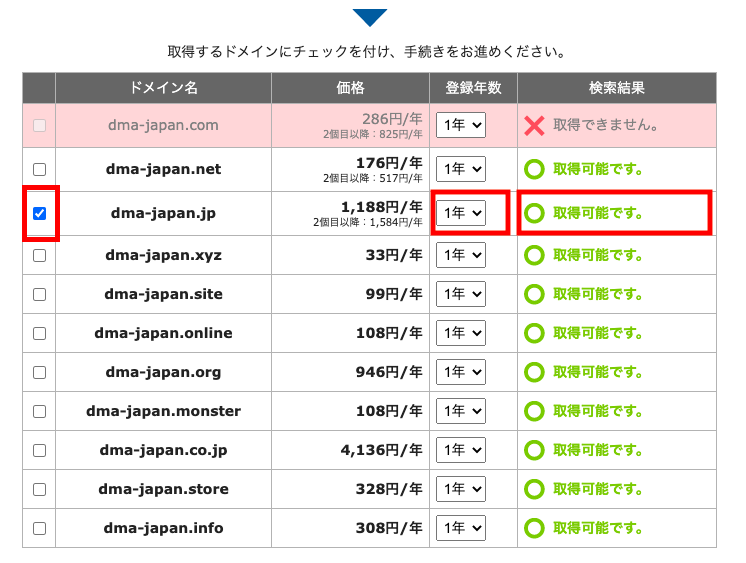取得可能なドメイン名一覧が出てきます。検索結果の欄が「取得可能です。」となっているものが取得可能なものです。取得するドメイン名にチェックを入れ、登録年数を選択してください。