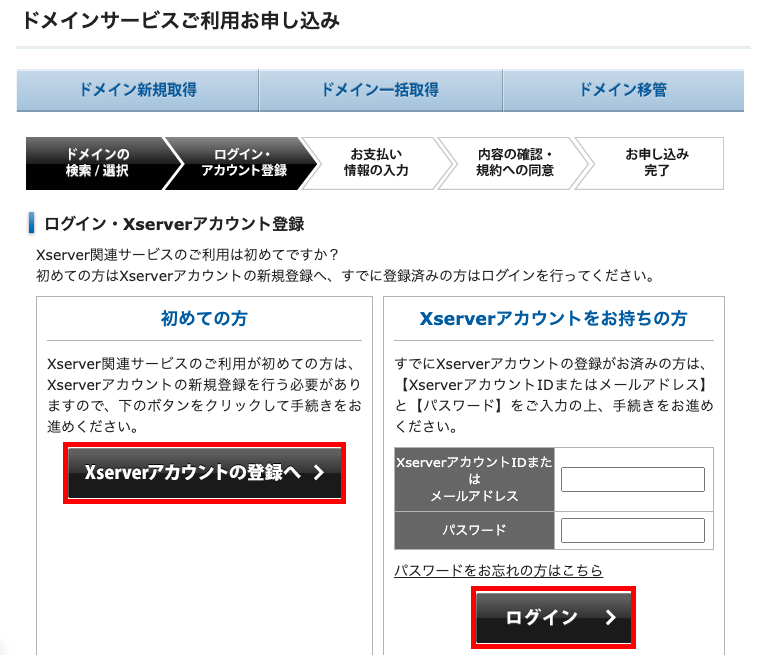 Xserverのアカウントを持っていない場合には、「Xserverアカウントの登録へ」ボタンをクリックしてください。既にXserverのアカウントを持っている場合には、IDとパスワードを入力し、「ログイン」ボタンをクリックしてください。