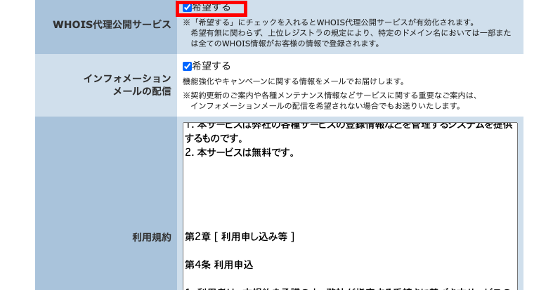 Whois代理公開サービスを希望する場合には、「希望する」にチェックを入れてください。希望しない場合には、チェックを外してください。