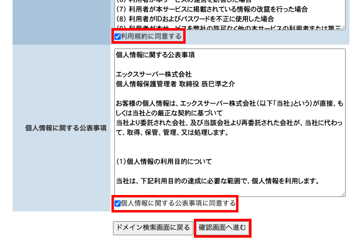 申込内容、登録情報、支払情報に間違いがないかを確認してください。問題がなければ、「エックスドメイン利用規約」および「個人情報の取り扱い」を読んでください。内容に同意する場合には、「同意する」にチェックを入れ、「申し込む」ボタンをクリックしてください。