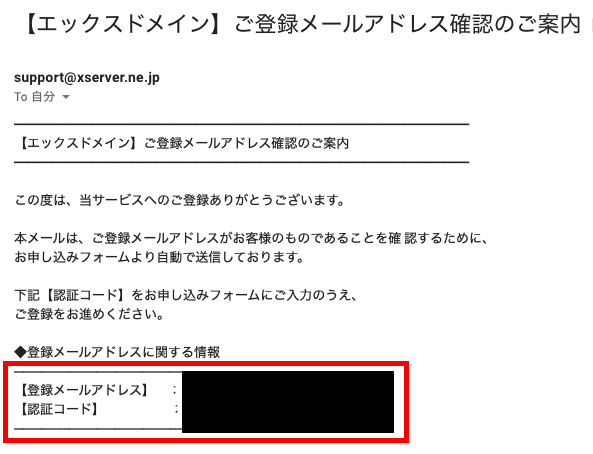 すぐに、「【エックスドメイン】ご登録メールアドレス確認のご案内」というタイトルのメールが届きます。