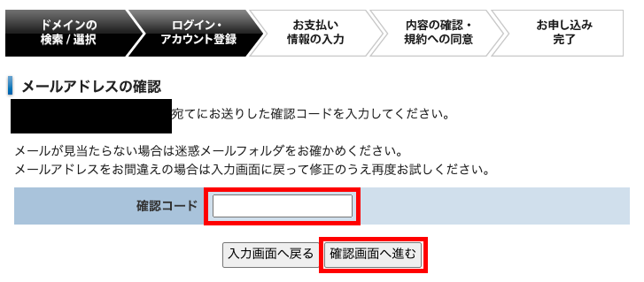 メールに記載されている「確認コード」をメールアドレスの確認画面に入力し、「確認画面へ進む」ボタンをクリックしてください。