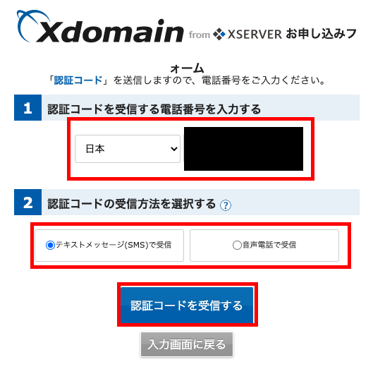 テキストメッセージ(SMS)または音声電話の自動応答によって通知される認証コードを画面に入力してください。