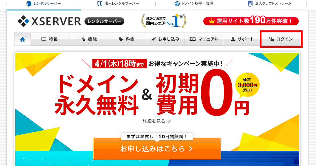 Xserverの公式サイトにアクセスし、「ログイン」ボタンをクリックしてください。