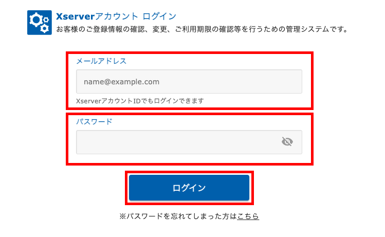 「XserverアカウントID(またはメールアドレス)」と「パスワード」を入力し、「ログイン」ボタンをクリックしてください。