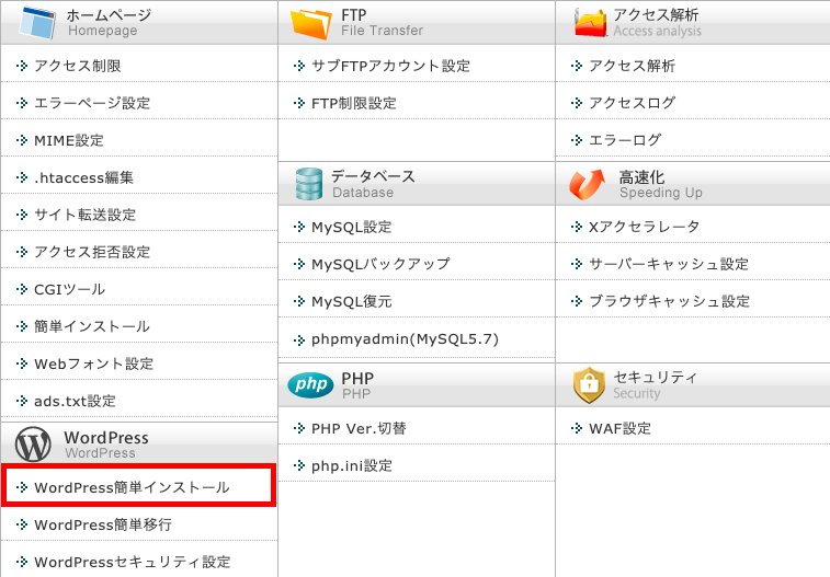 すると、管理画面に移ります。ページの下方にある「WordPress簡単インストール」ボタンをクリックしてください。