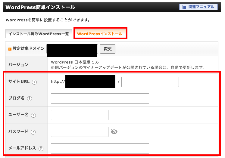 「Wordpressインストール」ボタンをクリックし、必要情報を入力してください。
