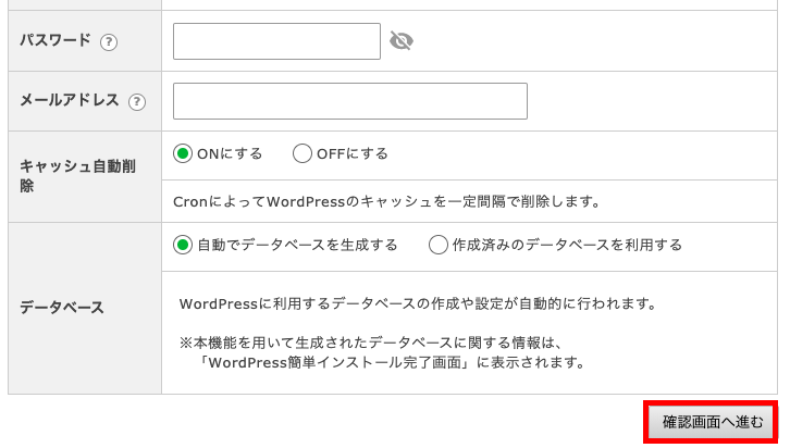 - データベース:今回新たにWordpressを始める場合には、「自動でデータベースを生成する」を選択してください。