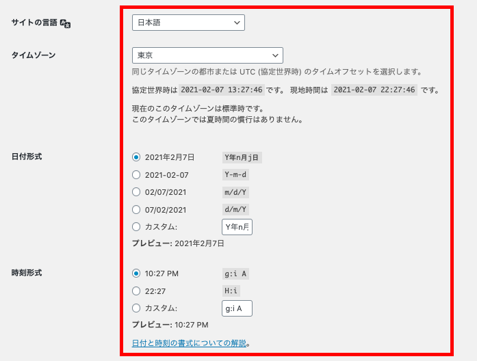 ブログ記事やWebサイトで使用する言語やタイムゾーン、日付形式の設定を行います。日本語版のWordpressをインストールした場合は、既に日本用に最適化されているため、特に変更する必要はありません。