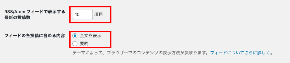 - 表示設定:トップページの表示形式やRSSフィードでの表示設定に関する設定です。
