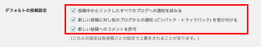 「新しい投稿に対し他のブログからの通知(ピンバック・トラックバック)を受け付ける」にチェックを入れると、他のブログから自分が投稿したブログ記事内へのリンクが貼られた場合、あなたに通知が届くようになります。これはピンバックと呼ばれており、双方のブログがWordpressで作られたものである場合のみに有効となる機能です。