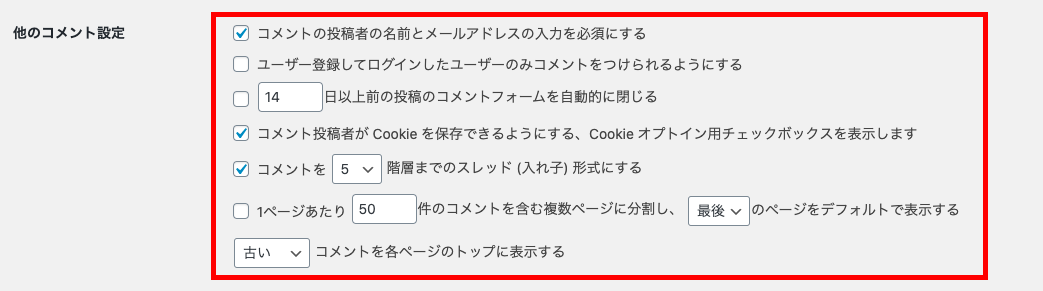 「1ページあたり50件のコメントを含む複数ページに分割し、最後のページをデフォルトで表示する古いコメントを各トップに表示する」は、1ページに表示できる最大コメント数の表示と、新しいコメントと古いコメントのどちらをトップに表示するのかに関する設定です。ここはデフォルト設定のままで問題ありません。