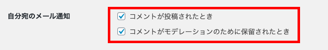 「コメントがモデレーションのために保留されたとき」にチェックを入れると、投稿されたコメントを表示させるためには承認が必要という設定にしている場合、コメントの承認待ちがある旨を通知してくれます。これはチェックを入れたままで問題ありません。