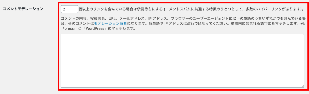 「2個以上のリンクを含んでいる場合は承認待ちにする」にチェックを入れると、2個以上のリンクを含むコメントは承認待ちとなります。