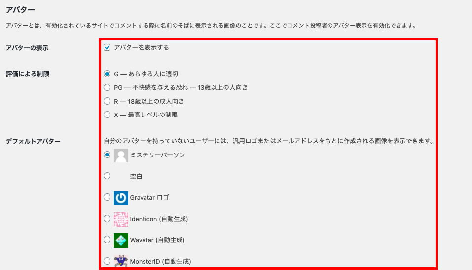 デフォルトアバターもデフォルト設定のままで問題ありませんが、好みのものがあれば変更しておきましょう。