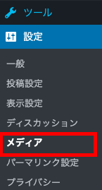 WordPress管理画面の左側にあるメニューの中から、「設定」ボタンをクリックした後に、「メディア」ボタンをクリックしてください。