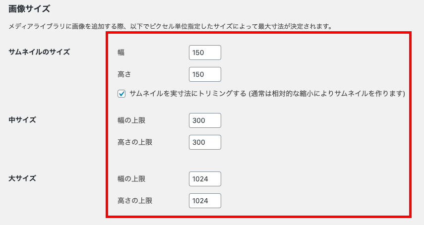 メディア設定では、ブログに載せる画像のアップロードに関する設定を行うことができます。設定項目は2つあります。