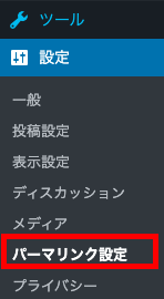 WordPress管理画面の左側にあるメニューの中から、「設定」ボタンをクリックした後に、「パーマリンク設定」ボタンをクリックしてください。