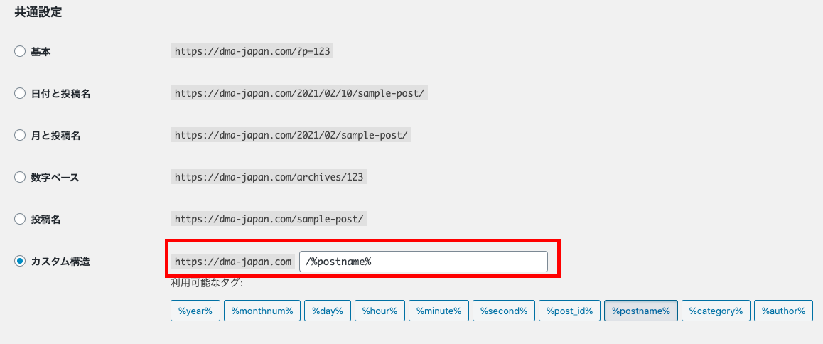ここでは、パーマリンクに関する詳細設定を行うことができます。