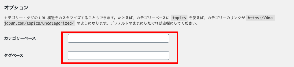 当サイトではカテゴリーベースまたはタグベースのパーマリンクはおすすめしていませんので、ここは空欄で問題ありません。