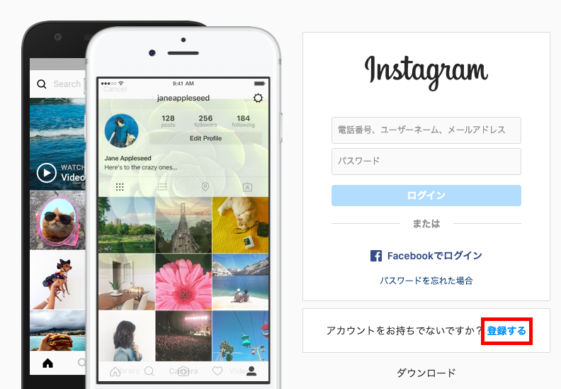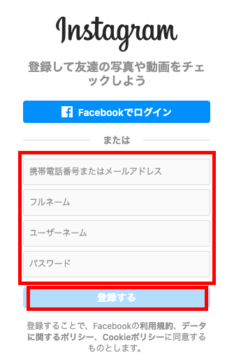 「電話番号またはメールアドレス」、「フルネーム」「ユーザーネーム」、「パスワード」の4項目を入力し、「登録する」ボタンをクリックしてください。