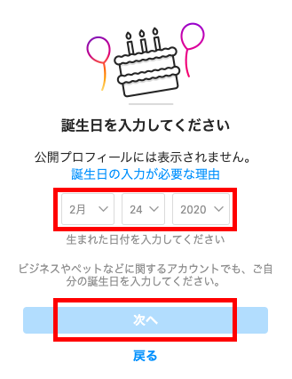 「誕生日」を入力し、「次へ」ボタンをクリックしてください。