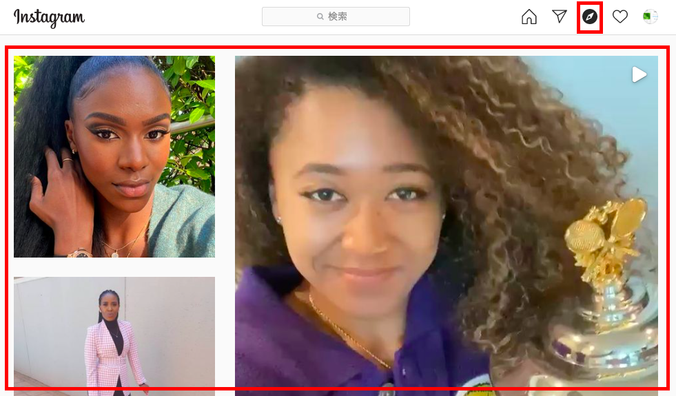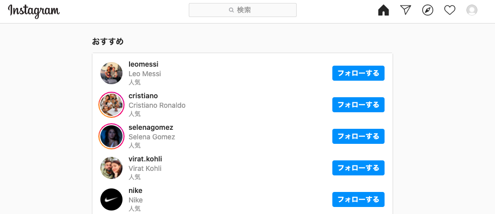 「コンパスのマーク」をクリックすると、「おすすめのインスタグラムアカウント」画面に移ります。ここには、あなたがフォローできるおすすめのインスタグラムアカウントが表示されます。