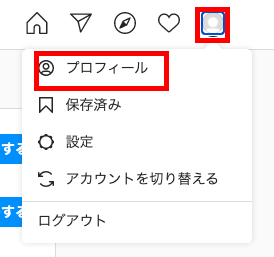 インスタグラムホーム画面の右上に表示されているメニュー一覧の中から、「顔のマーク」をクリックし、「プロフィール」ボタンをクリックしてください。