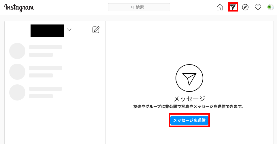 「紙飛行機のマーク」をクリックすると、メッセージ画面に移ります。ここには、他のアカウントとのダイレクトメッセージのやり取りが表示されます。