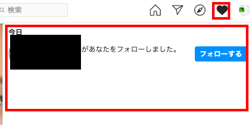 「ハートのマーク」をクリックすると、最近のアクティビティ一覧が表示されます。アクティビティとは、あなたのアカウントがフォローされる、あなたの投稿に「いいね」が付くなどのアクションのことです。