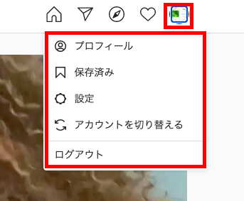 「あなたのプロフィール写真」をクリックすると、各種設定メニューが表示されます。ここでは、プロフィールの設定やインスタグラムの詳細設定を変更できます。また、アカウントからログアウトする場合にはここからできます。